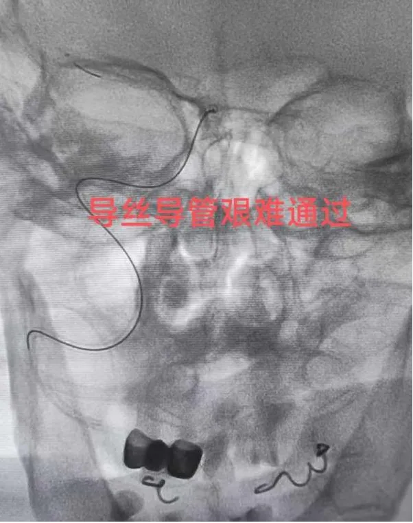 “必须立即进行脑动脉取栓手术!”神经内科王文杰主任了解患者详情后当机立断。与家属充分沟通并获得同意后,患者被迅速送入介入治疗室。术中造影显示,患者右侧大脑中动脉M1末端完全闭塞。术中造影发现患者多发动脉硬化、狭窄,血管迂曲明显,情况复杂,手术难度较高。且患者病情进展加重,王文杰、于弋水决定在局麻下为患者急诊动脉机械取栓。根据患者血管特点,选用合适导管行“血栓抽吸术”,仅一次操作即完整取出暗红色血栓,原闭塞血管血流瞬间恢复至最高分级(mTICI 3级),从穿刺到血管完全再通仅用50分钟。