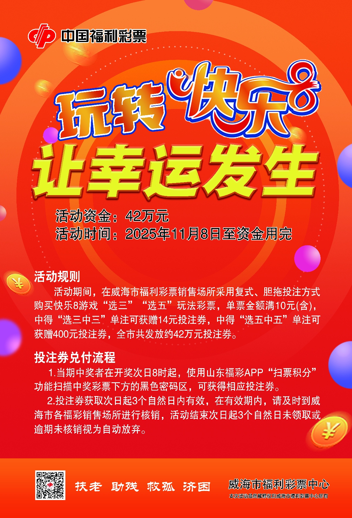 威海福彩“快乐8”营销,11月8日开启,选三、选五玩法奖上加奖