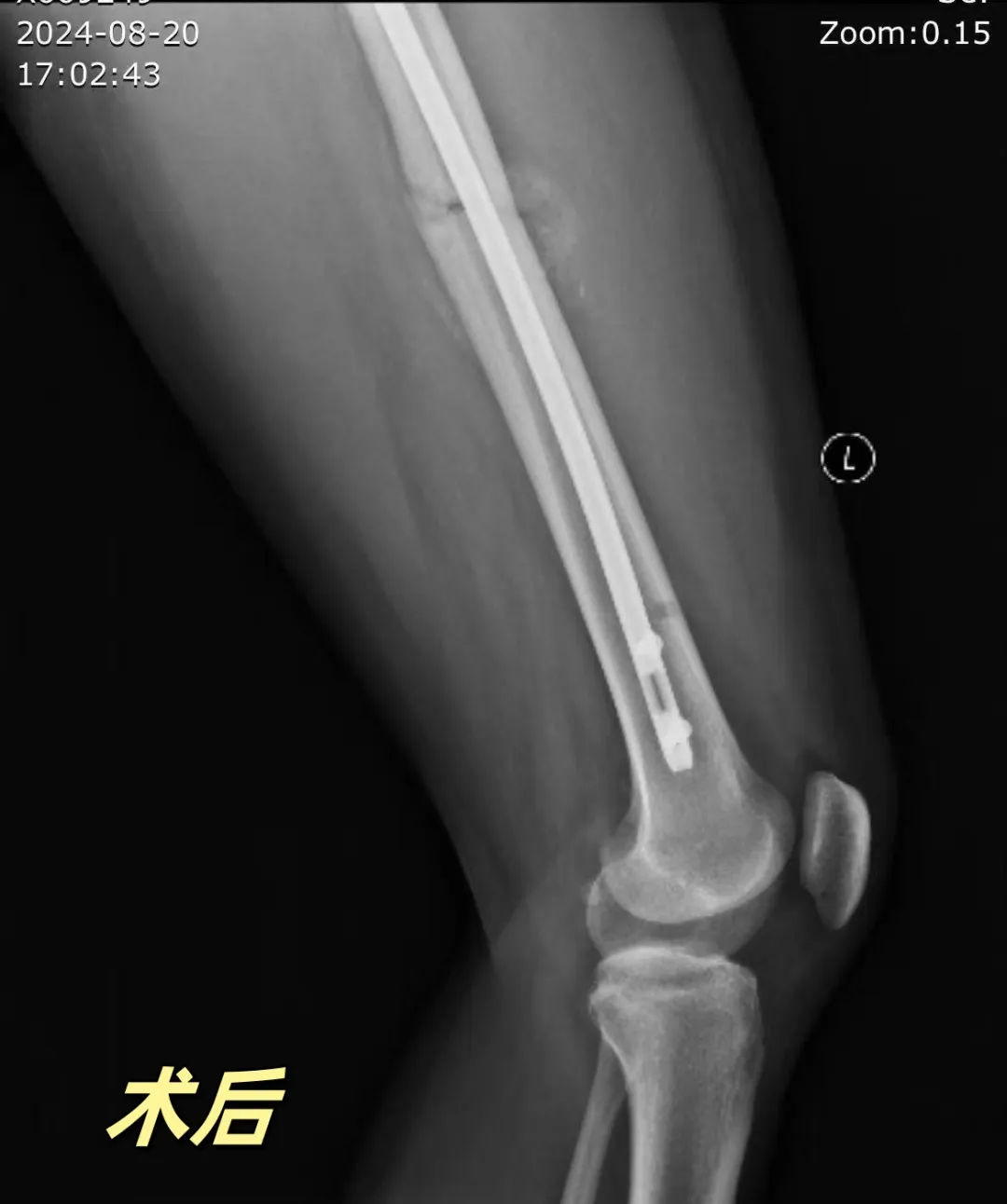 前不久“小明同学”骑电动车不慎摔伤左大腿,到威海卫人民医院关节外科门诊检查诊断为“左股骨中段骨折”,并予以初步固定,缓解患者疼痛。经过详细的检查和评估,专家团队决定为小明同学实施股骨髓内钉手术。手术由毕前航主任亲自主刀,凭借精湛的技术、丰富的髓内钉固定经验,团队默契配合精准地将髓内钉植入骨髓腔中,对骨折部位进行内固定。整个手术过程仅耗时一个多小时,出血量少,创伤小。