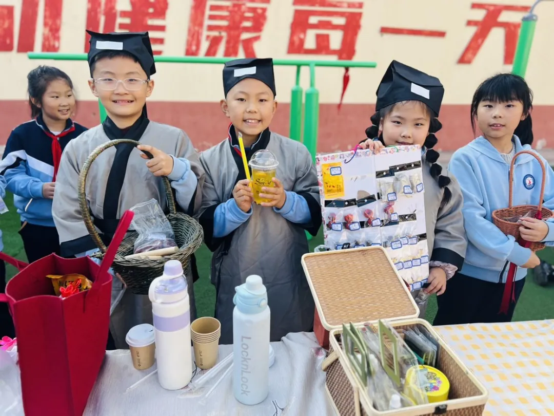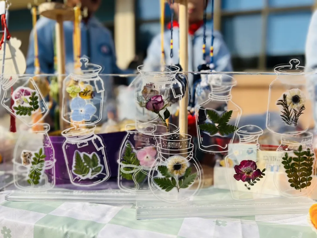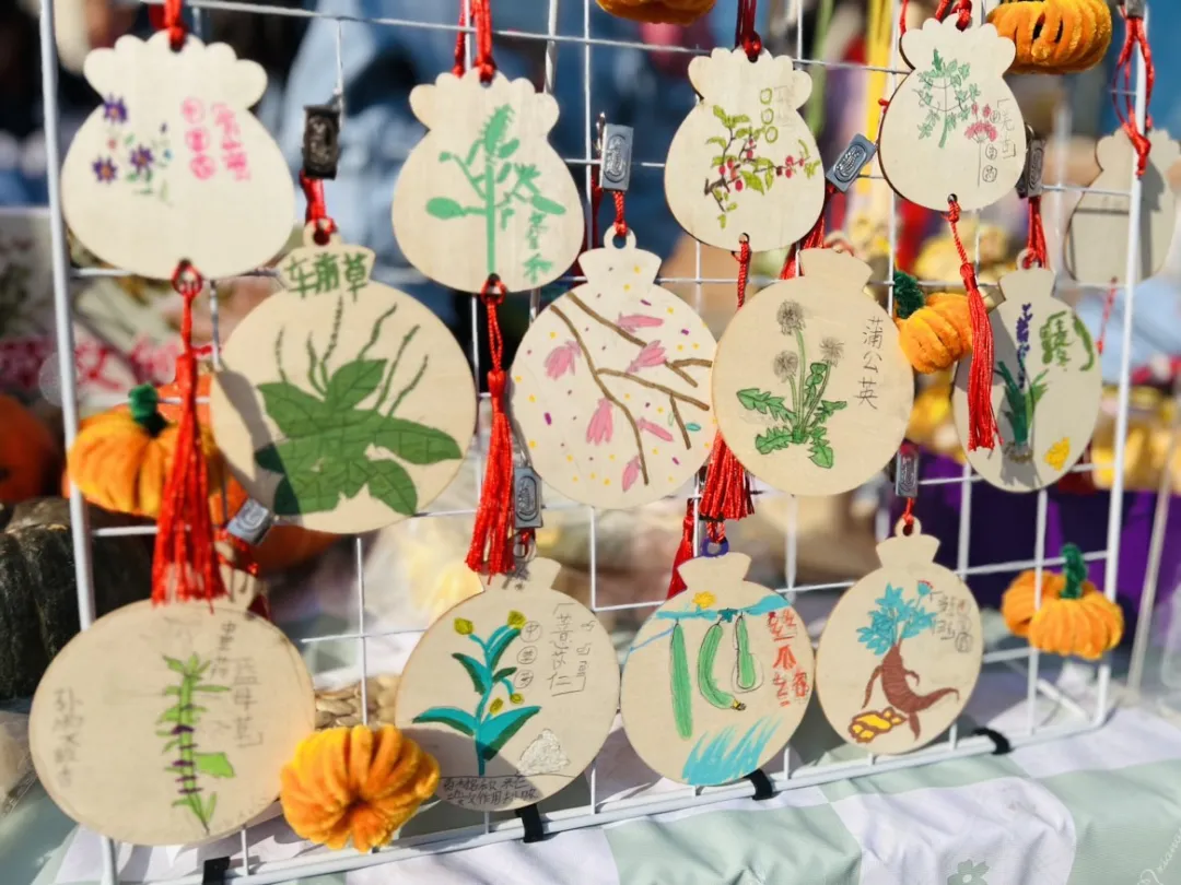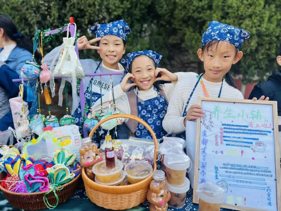 一年级的 “百草小向导” 们手持卡通名片,绘声绘色地介绍薄荷、艾草的小知识,搭配可爱的叶片标本赠品,瞬间点燃现场氛围;二年级的 “手作小工匠” 们亮出亲手制作的百草书签、迷你香囊,萌趣摊位前吆喝声不断,文创产品和养生茶饮深受大家喜爱。