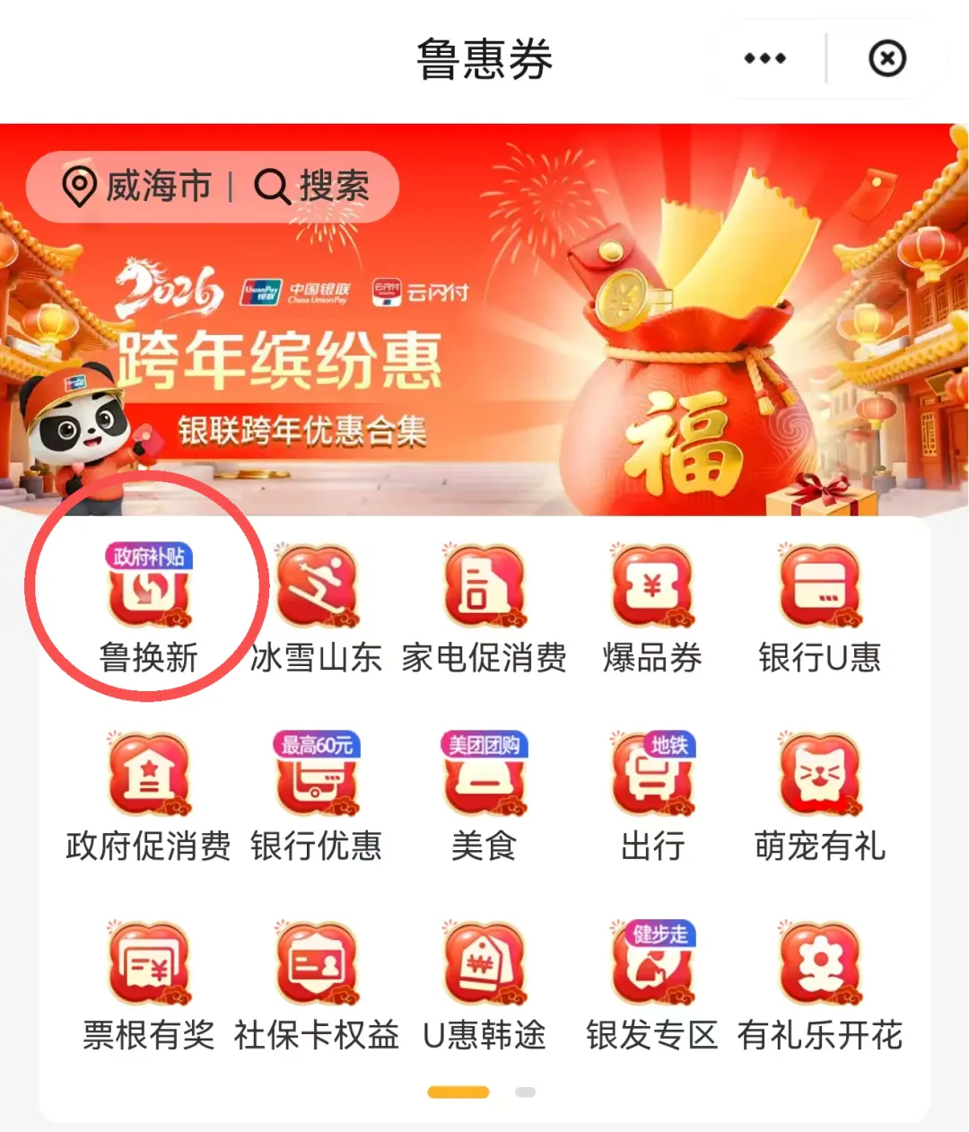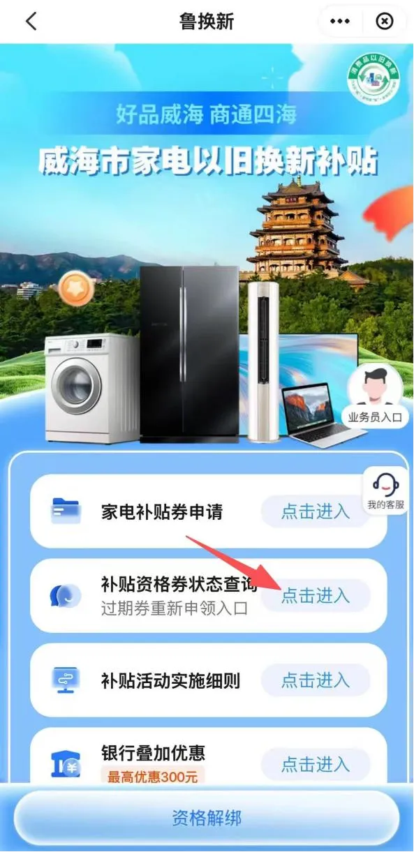 路径1.登录“云闪付”App,定位威海地区,选择“鲁惠券”—“鲁换新”—“家电以旧换新”或“数码和智能产品购新补贴申请”,完成实名认证,系统校验资格成功后,领取补贴资格。